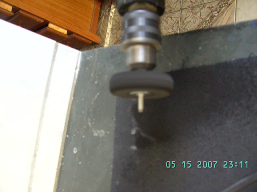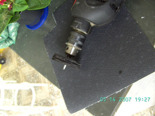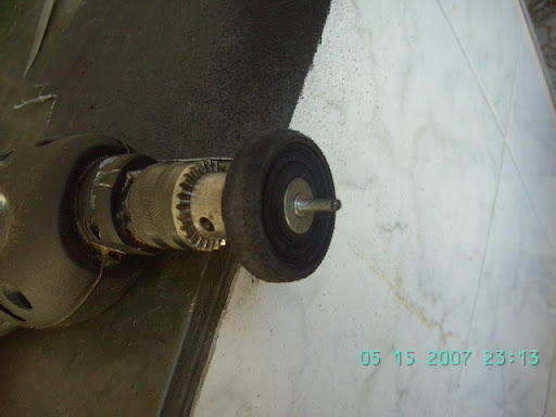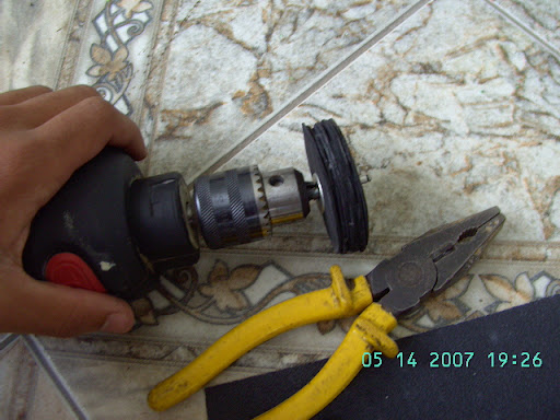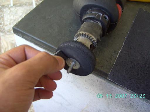Depois prenda a roda na furadeira.Para a roda não girar em falso costumo colocar duas arruela em volta da roda.