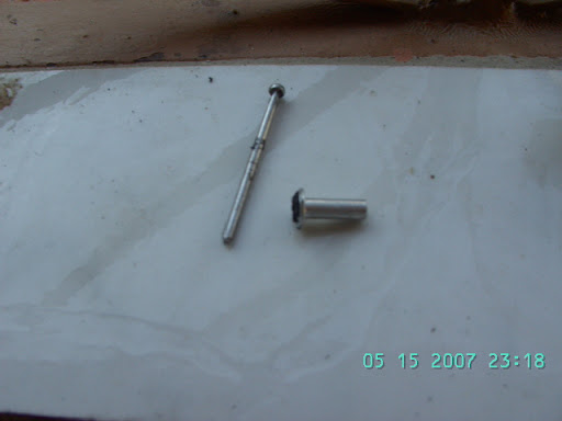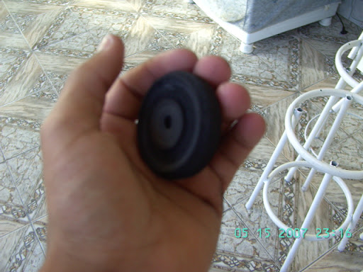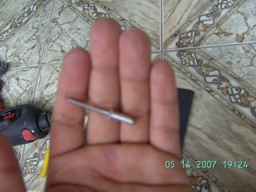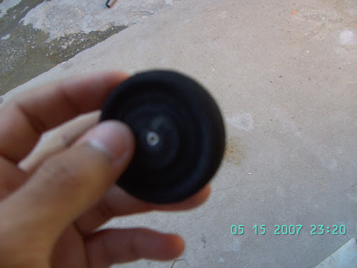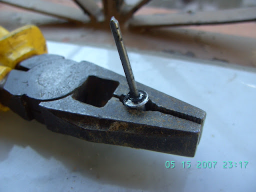 Pronto, voce ja tem as rodas. Agora vamos fazer o meio dela onde voce vai encaixar o trem de pouso.Tire a roda da furadeira, pegue o rebite que voce usou na roda e tire a base dele. Basta segurar a base dele com o alicate e bater com ele no chão, ele vai soltar facinho.