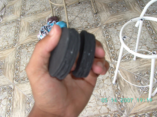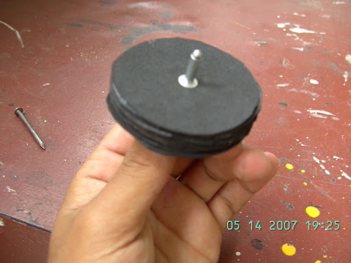 Ligue a furadeira e encoste a roda na lixa com a furadeira ligada ate ela tomar formato de rodas.