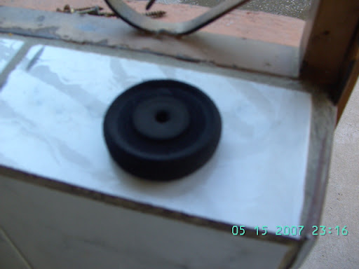 Depois prenda a roda na furadeira.Para a roda não girar em falso costumo colocar duas arruela em volta da roda.