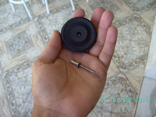 Pronto, voce ja tem as rodas. Agora vamos fazer o meio dela onde voce vai encaixar o trem de pouso.Tire a roda da furadeira, pegue o rebite que voce usou na roda e tire a base dele. Basta segurar a base dele com o alicate e bater com ele no chão, ele vai soltar facinho.
